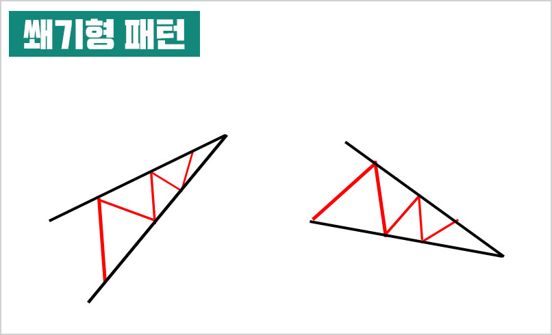 쐐기형 패턴은 삼각 수렴패턴의 한 종류로 시간이 지날 수록 파동의 폭이 좁아지는 것은 같으며 수렴이 될 때쯤에 반대방향으로 큰 상승 혹은 하락을 한다는 특징을 보인다.