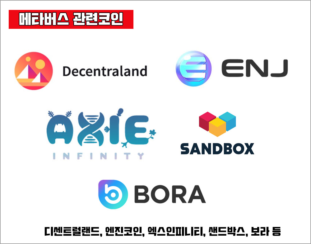 메타버스 관련 코인으로는 디센트럴랜드, 엔진코인, 엑스인피니티, 샌드박스, 보라 등이 있다.