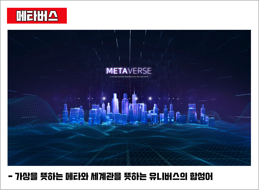 메타버스는 가상을 뜻하는 메타와 세계관을 뜻하는 유니버스의 합성어이다. 메타버스는 코인을 이용해서 NFT를 구매할 수 있다.
