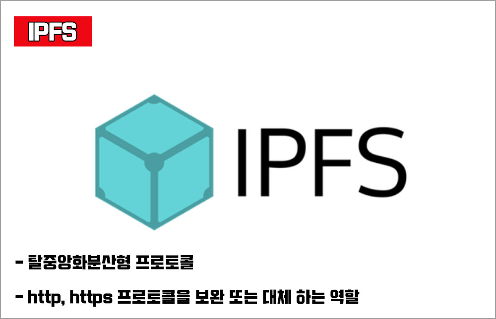 IPFS는 탈중앙화분산형 프로토콜로 http, https 프로토콜을 보완 또는 대체하는 역할을 하고 기존의 HTTP 방식은 데이터가 위치한 곳의 주소를 찾아가서 원하는 콘텐츠를 한꺼번에 가져오는 방식이라면 IPFS는 데이터의 내용을 변환한 해시값을 이용하여 전 세계 여러 컴퓨터에 분산 저장되어 있는 콘텐츠를 찾아 데이터를 조각조각을 나눈다.
