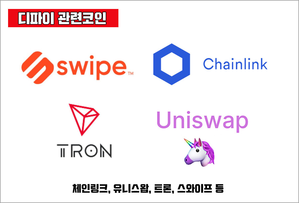 디파이 관련코인으로 체인링크, 유니스왑, 트론, 스와이프 등이 있다.