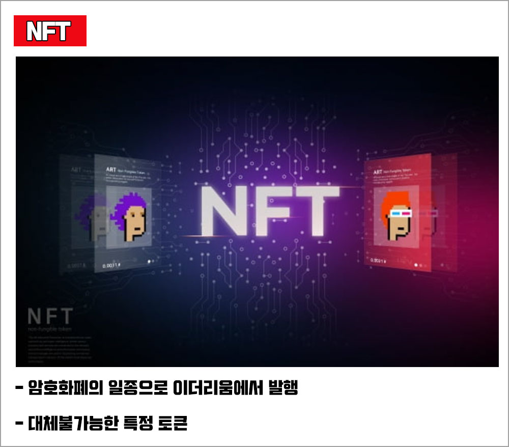 NFT는 암호화폐의 일종으로 이더리움에서 발행하며 대체불가능한 특정 토큰이다.