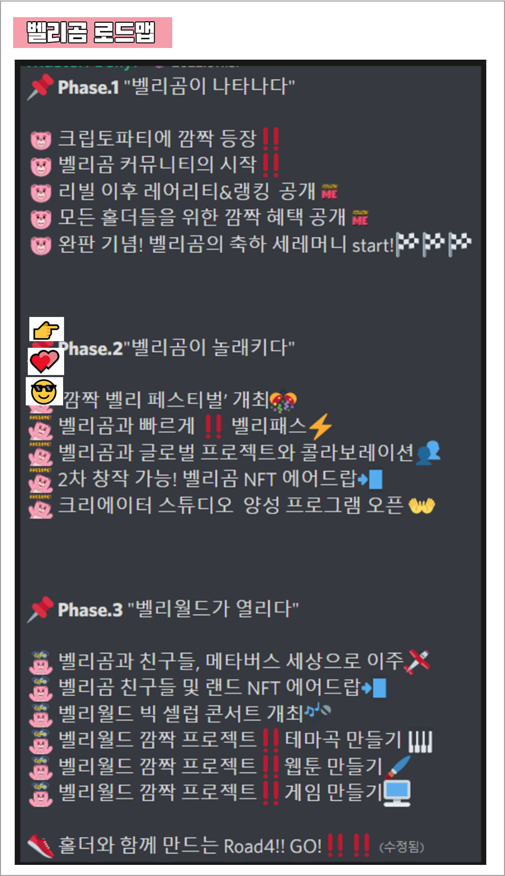 선미야 클럽 오프라인 홀더 파티에 벨리곰 등장으로 로드맵 시작으로 다양하게 진행된다. 로드맵에서 살펴볼 것은 페이즈2와 페이즈3이다. 신세계 NFT의 로드맵을 보면 MZ세대중 M세대를 공략했다면 벨리곰의 로드맵에서는 Z세대를 공략한 느낌이 든다.