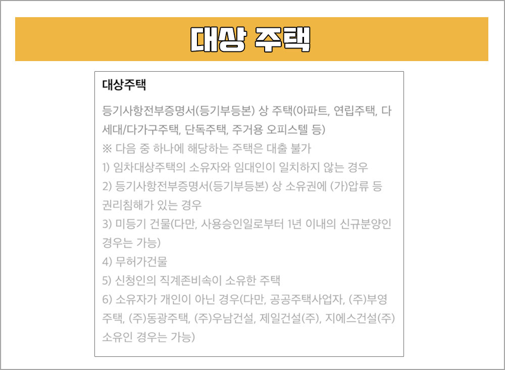 임차대상주택의 소유자와 임대인이 일치하지 않는 경우, 등기사항전부증명서 상 소유권에 압류 등 권리침해가 있는 경우, 미등기 건물, 무허가 건물, 신청인의 직계존비속이 소유한 주택, 소유자가 개인이 아닌 경우라면 대출이 불가하다.