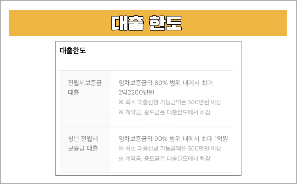 - 전월세보증금 대출 한도 : 최대 2.22억 한도로 보증금의 80%까지 대출