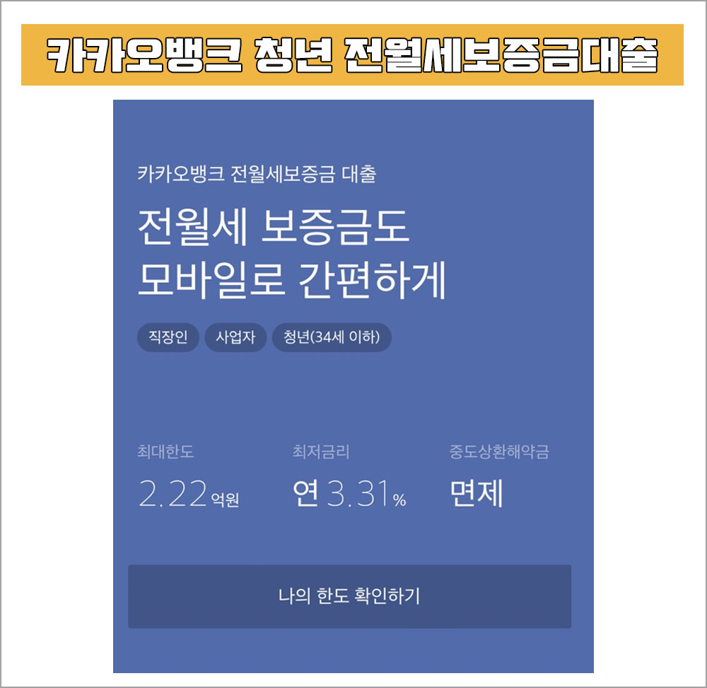 카카오뱅크에서 전월세보증금 대출은 최대한도 2.22억원, 최저금리 연 3.31%, 중도상환해약금 면제 혜택이 있다.