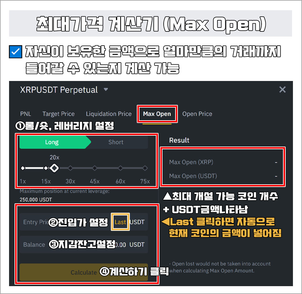 - Max Open , Max Open(USDT) 최대 개설 가능한 코인 개수와 USDT금액을 알려준다.