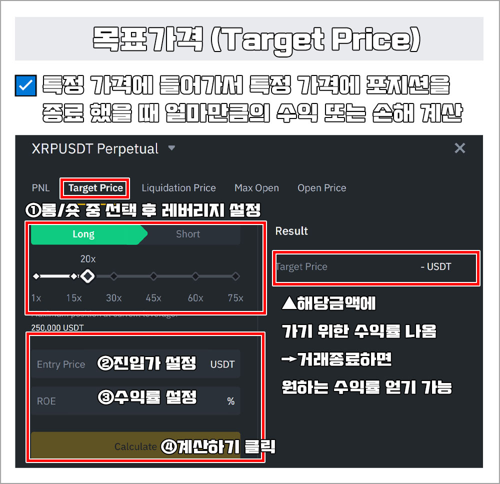 - Target Price 해당금액에 가기 위한 수익률이 나오며 거래종료를 하면 원하는 수익률 얻기가 가능하다.