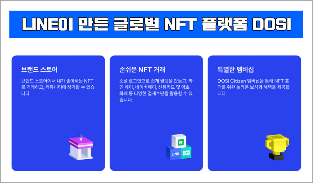 블록체인을 기반한 NFT 시장은 점점 커지고 있다. 국내 주요 대기업들도 NFT사업에 이미 많이 뛰어든 상태이다. 오늘은 네이버 라인넥스트의 NFT 플랫폼 DOSI에 대해 알아보자.