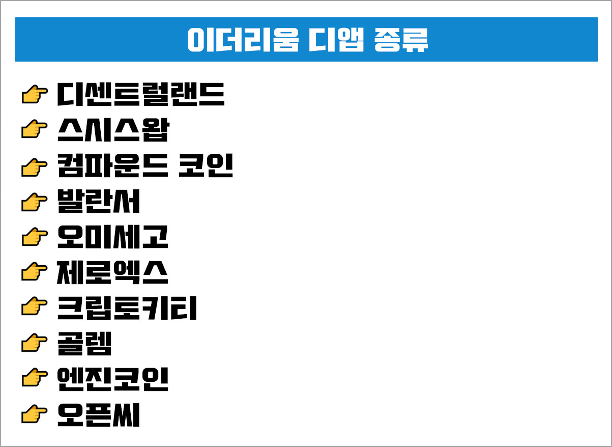 이더리움 디앱에는 디센트럴랜드, 스시스왑, 컴파운드 코인, 발란서, 오미세고, 제로엑스, 크립토키티, 골렘, 엔진코인, 오픈씨가 있다.