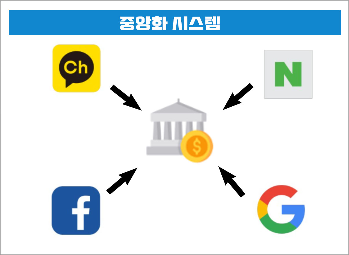 중앙화 시스템은 우리가 스마트폰에 깔려있는 앱으로 검색을 하거나 영상 시청 등을 하면 트랜잭션이 발생한다. 이는 중앙화되어 있는 구글등의 서버로 들어간다.