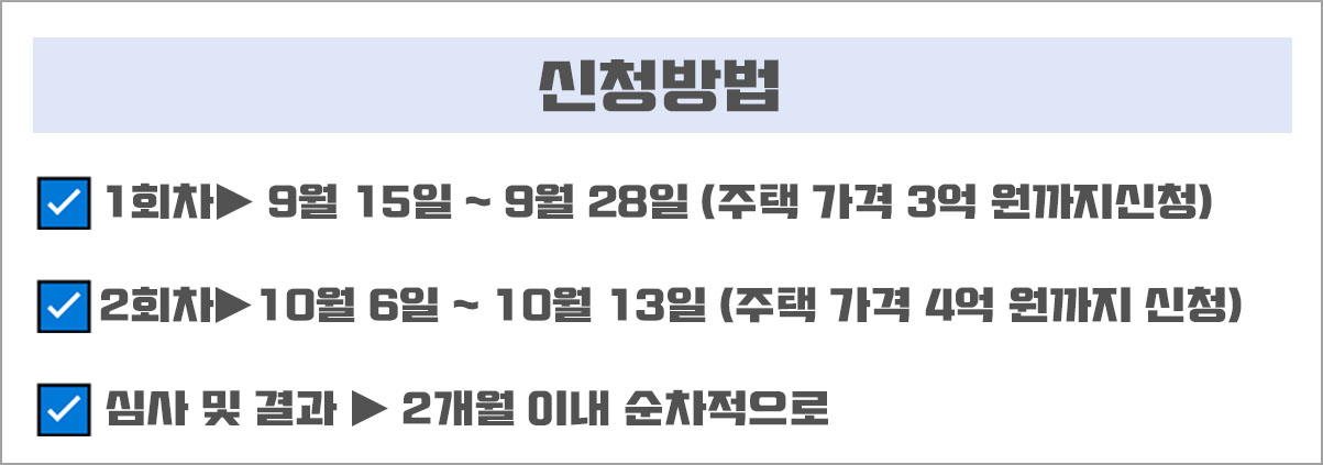 - 1차 : 주택 가격 3억 원까지 대상 : 9월 15일 ~ 9월 28일