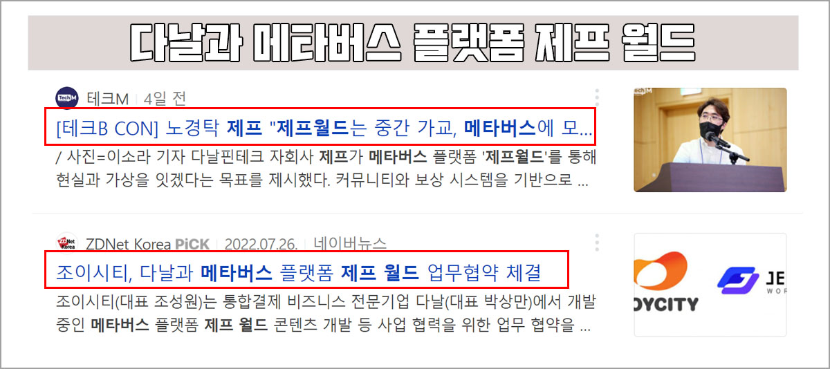 다날핀테크는 제프가 메타버스 플랫폼인 제프월드를 통해 현실과 가상을 잇겠다는 목표를 제시했다. 커뮤니티와 보상 시스템을 기반으로 선순환 구조를 만들고 메타커머스를 구현해 모든 것을 소비하고 즐길 수 있는 공간으로 만들겠다고 한다.