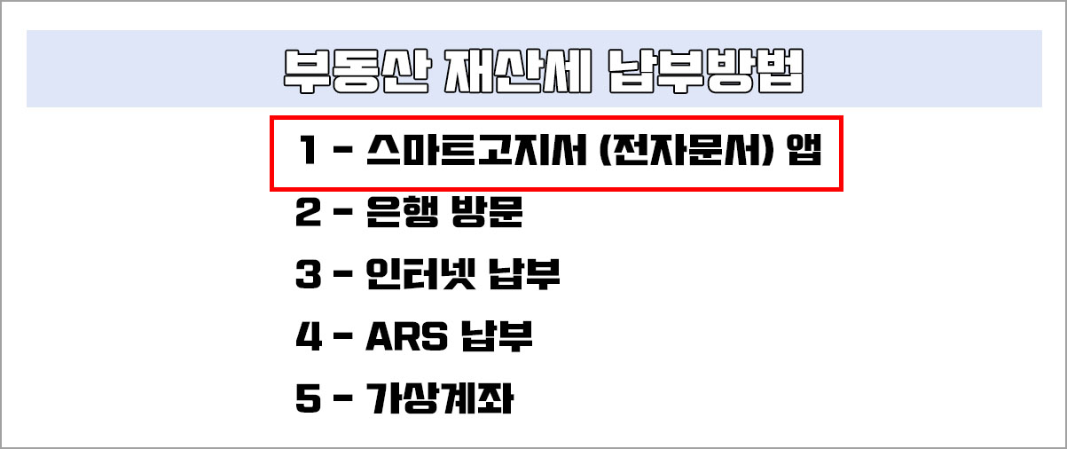 부동산 재산세는 스마트고지서, 은행방문, 인터넷 납부, ARS 납부, 가상계좌 중 선택하여 납부할 수 있다.