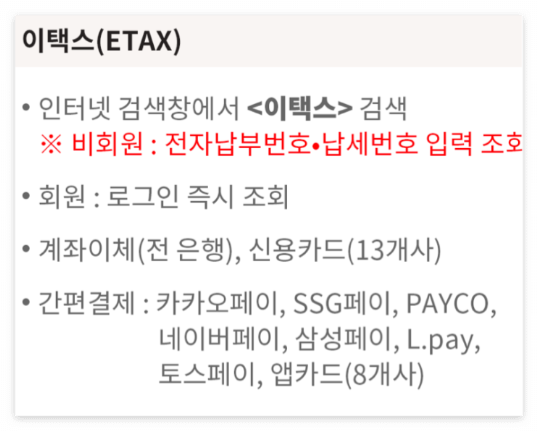 인터넷 포털 검색창에 [이택스]를 검색한 후 납부 가능하고 인터넷지로 (www.giro.or.kr), 위텍스(www.wetax.go.kr)에서도 납부가 가능하다.