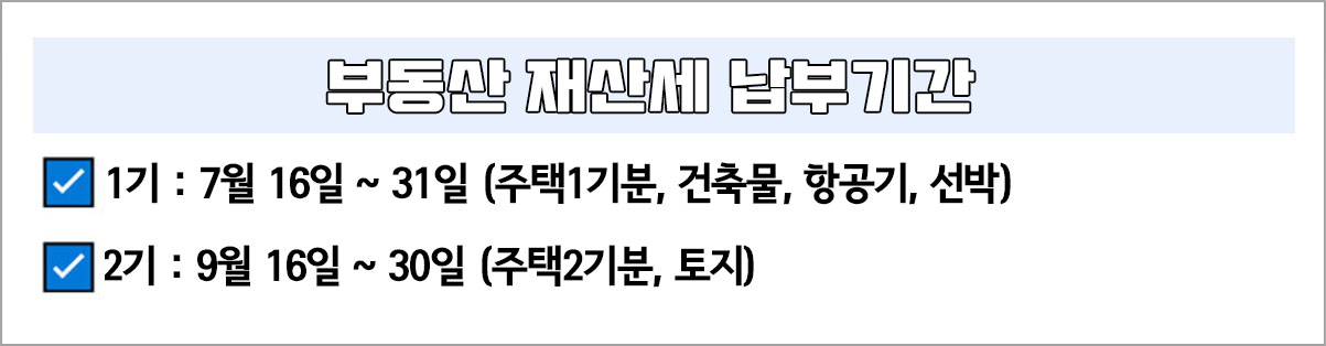 ▷1기 : 7월 16일 ~ 31일 (주택 1기분, 건축물, 항공기, 선박)