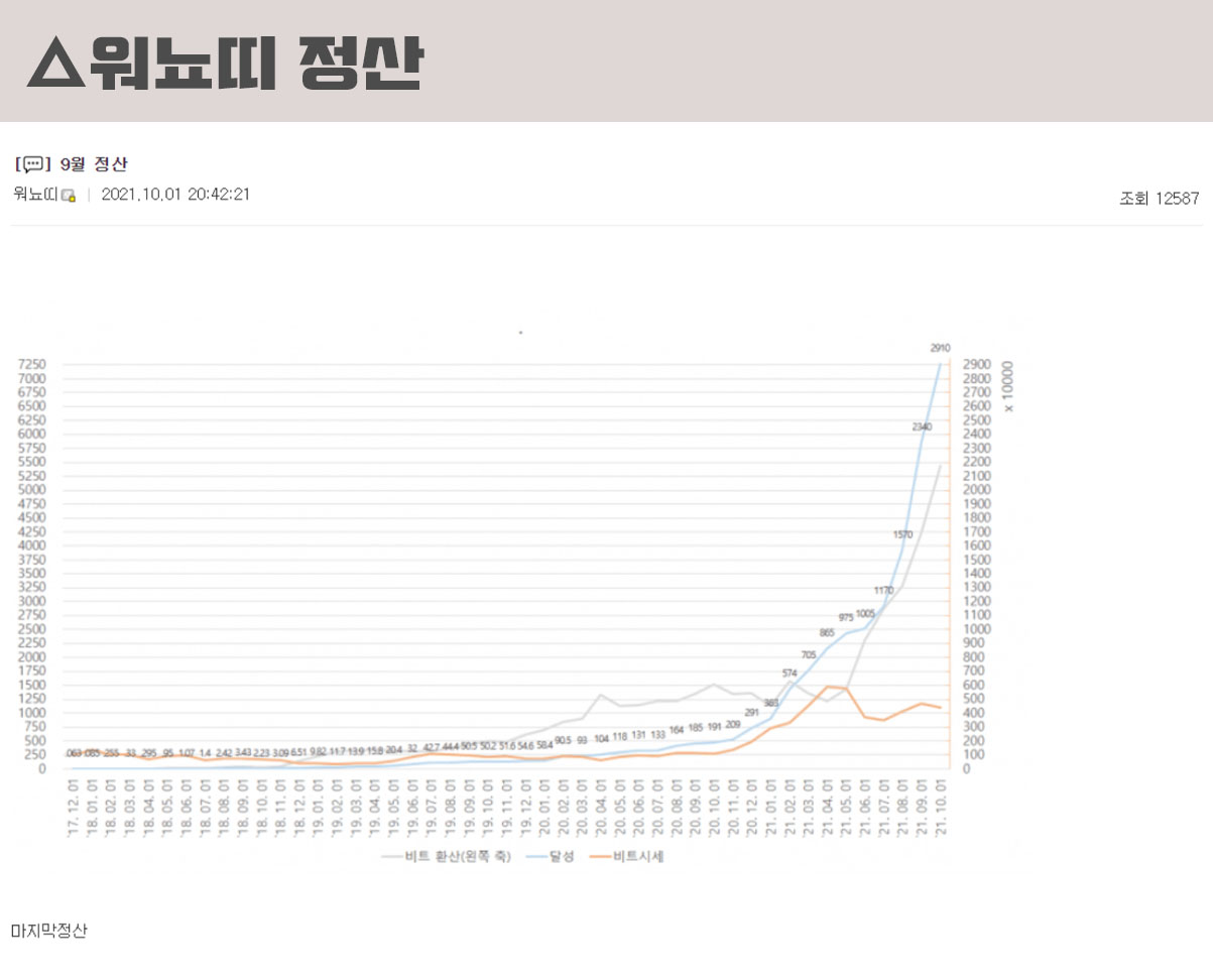 워뇨띠는 2018년 650만원으로 시작하여 2021년 9월 3000억원을 수익내고 인증하면서 코인 커뮤니티에서 유명하다. 특히 2018년도 하락장 초입으로 선물거래를 활용한 수익이다. 그는 자신의 매매법을 공유하거나 치킨 이벤트를 열어 더욱 화제가 되었다.