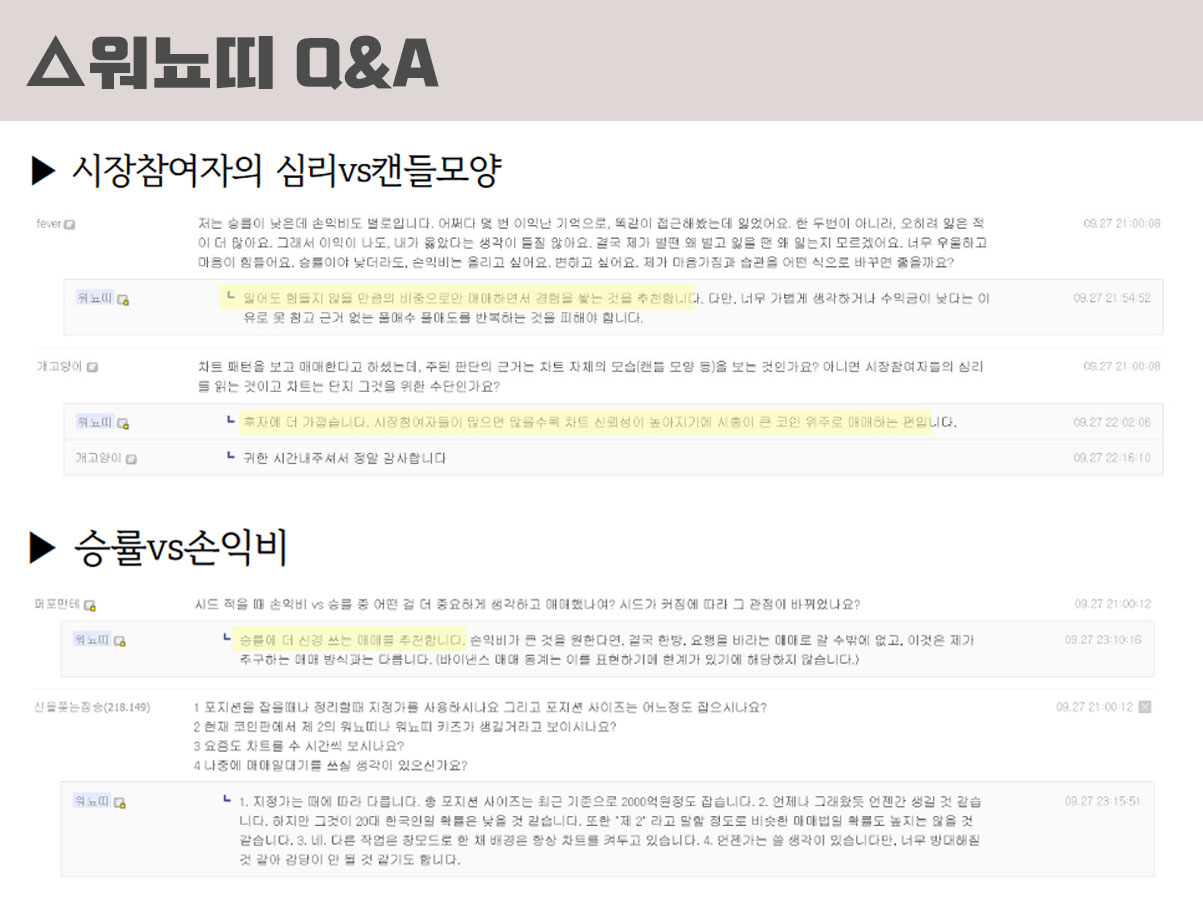 또한 워뇨띠 Q&A에서도 볼 수 있듯이 어떤 투자마인드로 임할것인지, 손실 때 멘탈관리는 어떤식으로 하는지도 참고하여 자신만의 투자 포토폴리오를 갖추기를 바란다.