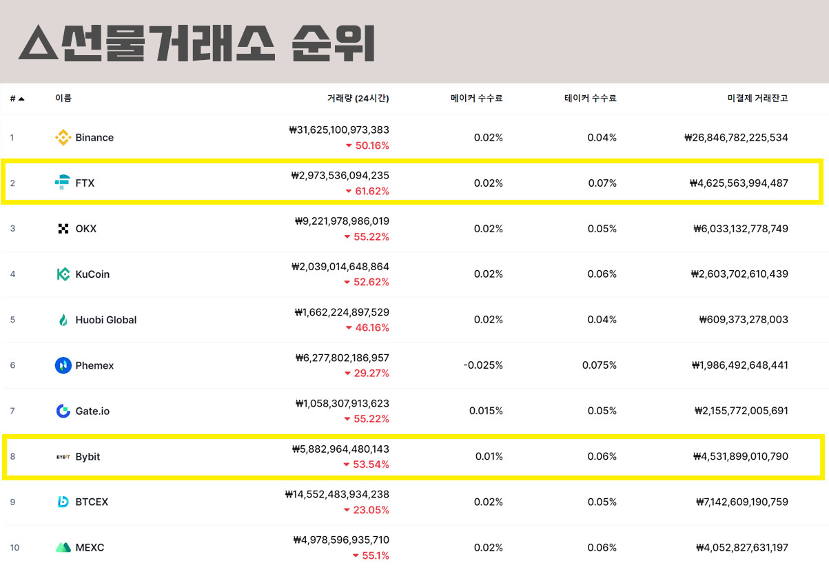 거래량 1위는 바이낸스이다. 그러나 바이낸스에서 한국어 서비스가 중단되고 타거래소에 비해 수수료가 비싸다는 점에서 FTX, 바이비트,OKX등을 이용하는 사용자도 많다.