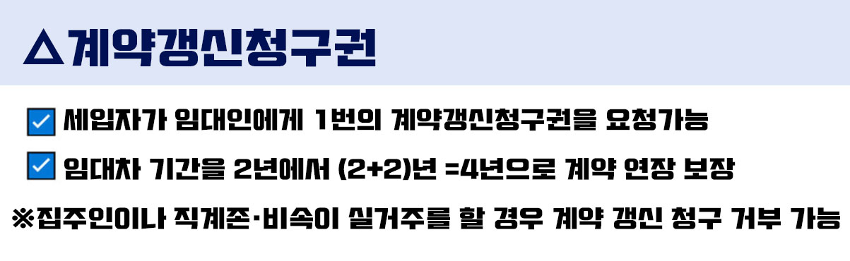 임차인이 계약한 집엥서 계속 거주하기를 원하는 경우 1회에 한정하여 2년 계약을 갱신해 청구하는 권리를 말한다. 임대료 급등으로 자주 집을 옮겨야 했던 임차인 보호를 위해 개선한 제도이다. 기존 기간에서 2년을 더 요구하는 권리를 법적으로 보장받는다.