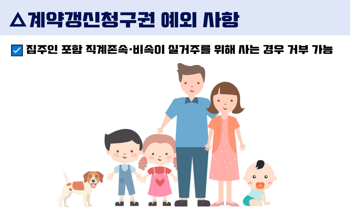 위에 설명했듯이 집주인을 포함하여 직계존속·비속이 실거주를 위해 세를 놓은 집에 들어올 경우에는 계약갱신청구권을 거부할 수 있는 조항이 있다.
