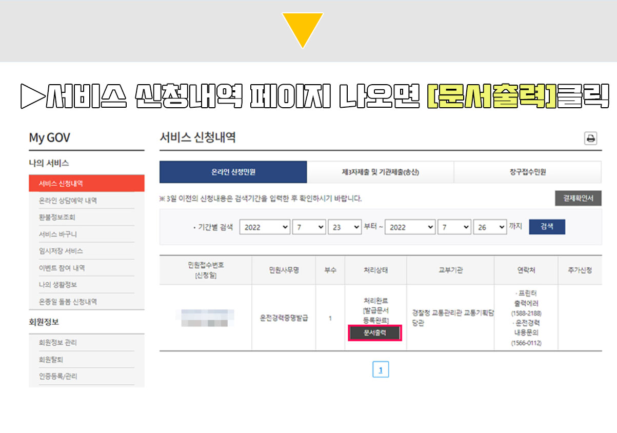 서비스 신청내역 페이지가 생성되면 [문서출력]을 선택한다.