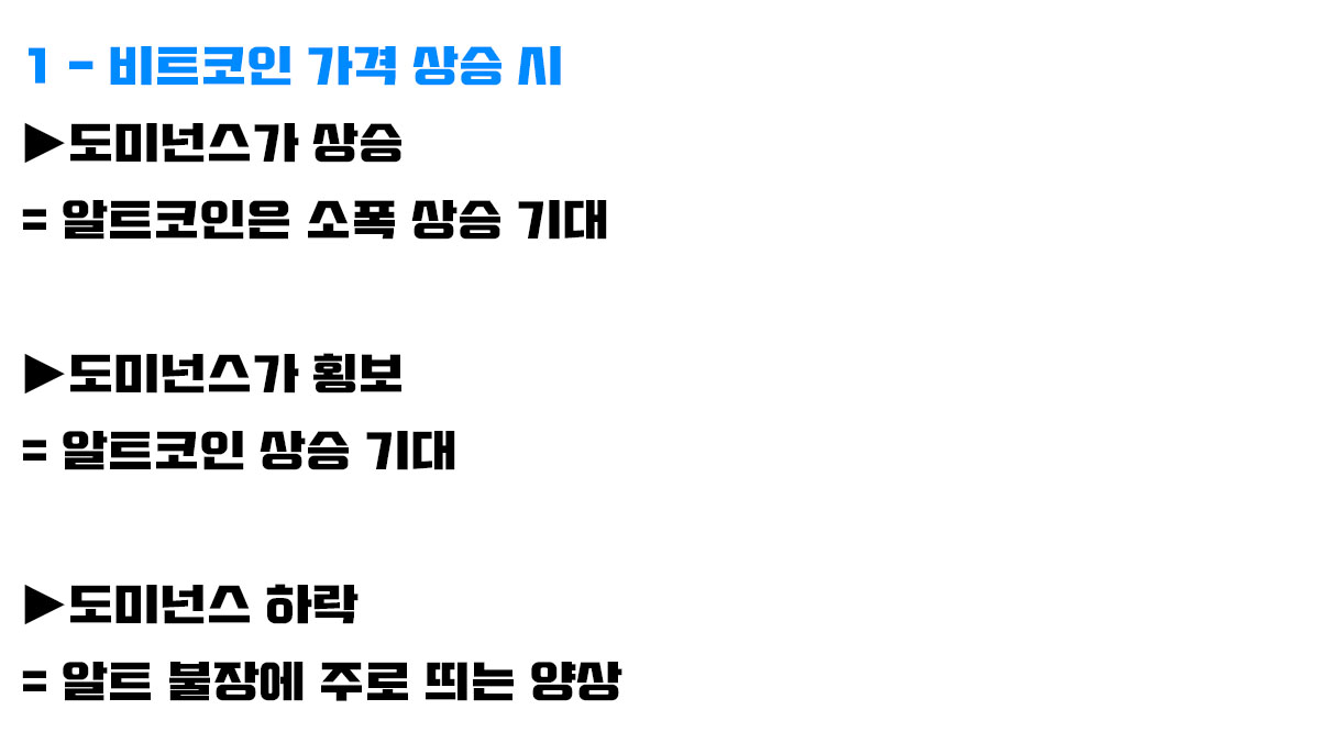 비트코인 가격이 하락하고 도미넌스가 상승하면 비교적 신뢰가 적은 알트코인에서 비트코인으로 자금 이동까지 일어나는 상황으로 해석할 수 있고 알트코인의 폭락을 예측할 수 있다.
