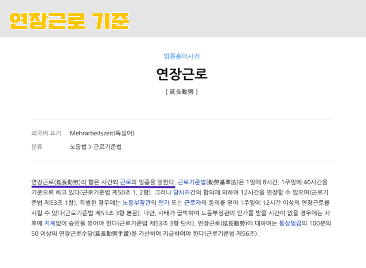 시간 외 근로의 일종으로 근로기준법에 따르면 하루 8시간 / 일주일에 40시간을 기준으로, 이 이상은 연장근로라고 본다.
