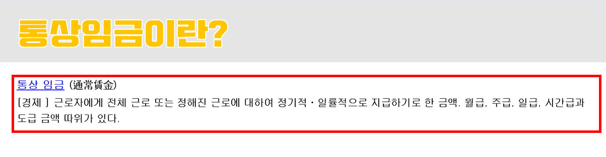 통상임근의 사전적 뜻을 살펴보면 근로자에게 전체 근로 또는 정해진 근로에 대하여 정기적·일률적으로 지급하기로 한 금액, 월급 주급, 일급, 시간급과 도급 금액 따위가 있다. 라고 나온다.