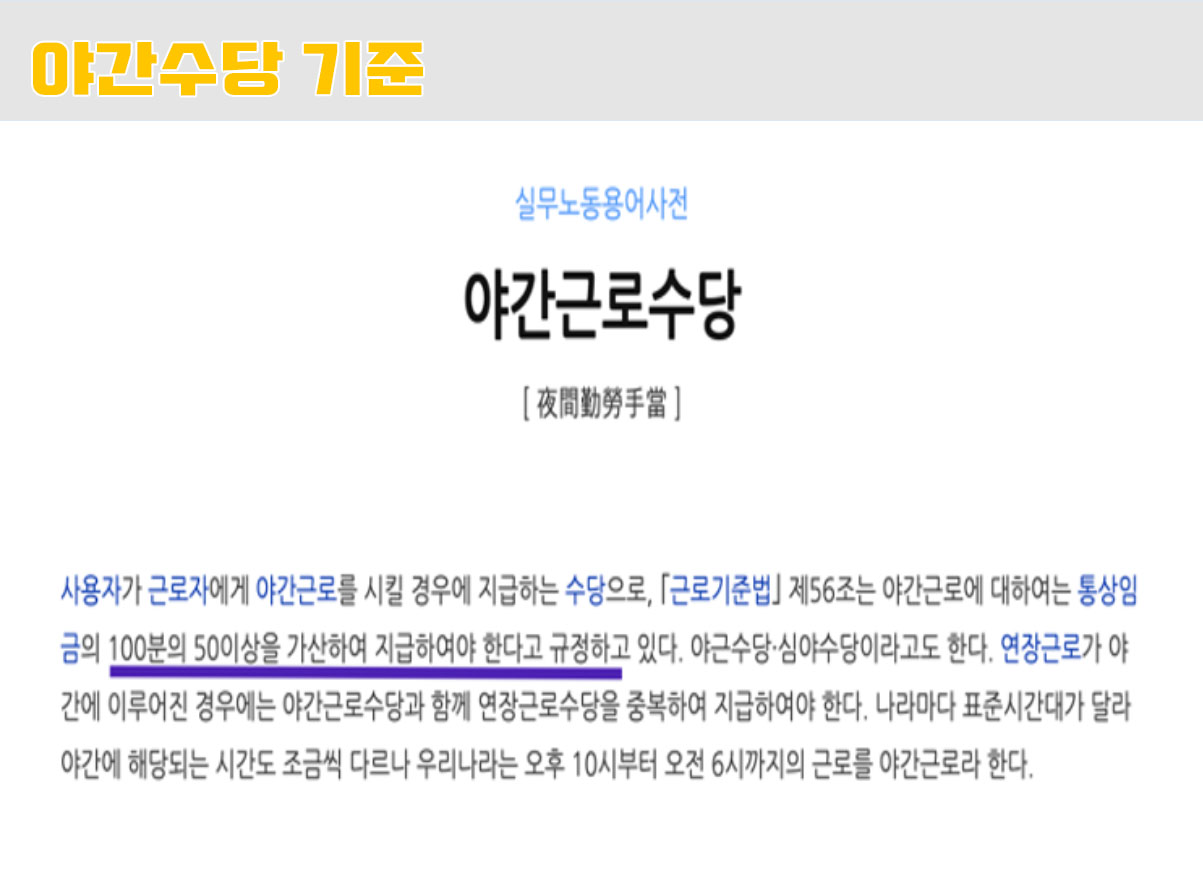 야간근로 시 받게 되는 수당이다. 기준은 오후 10시부터 오전 6시까지이다. 이 시간에 근로를 하게 되면 50% 가산이 붙게 되어 야간수당을 받는다.
