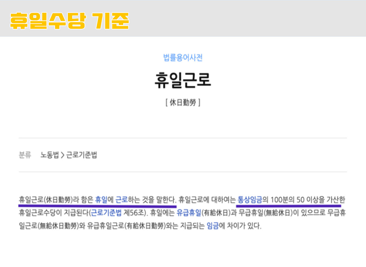 휴일에 근무를 하게 되면 휴일 수당을 받아야 한다. 휴일 수당은 통상임금의 100분의 50이상으로 50%를 가산하여 지급 받는다고 보면 된다.