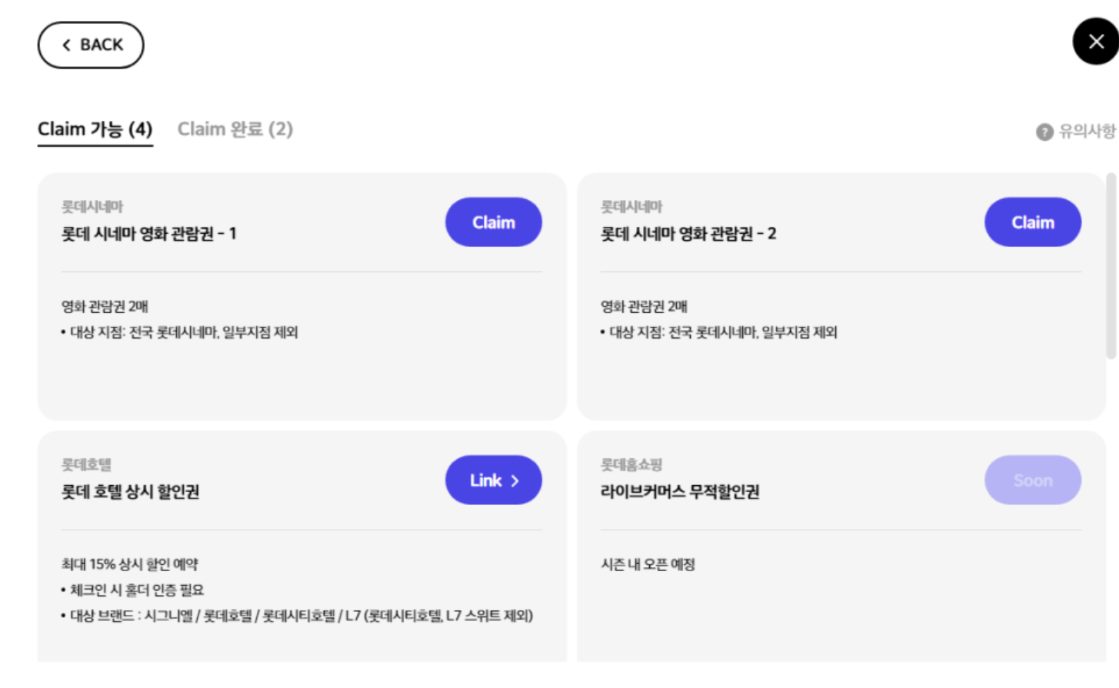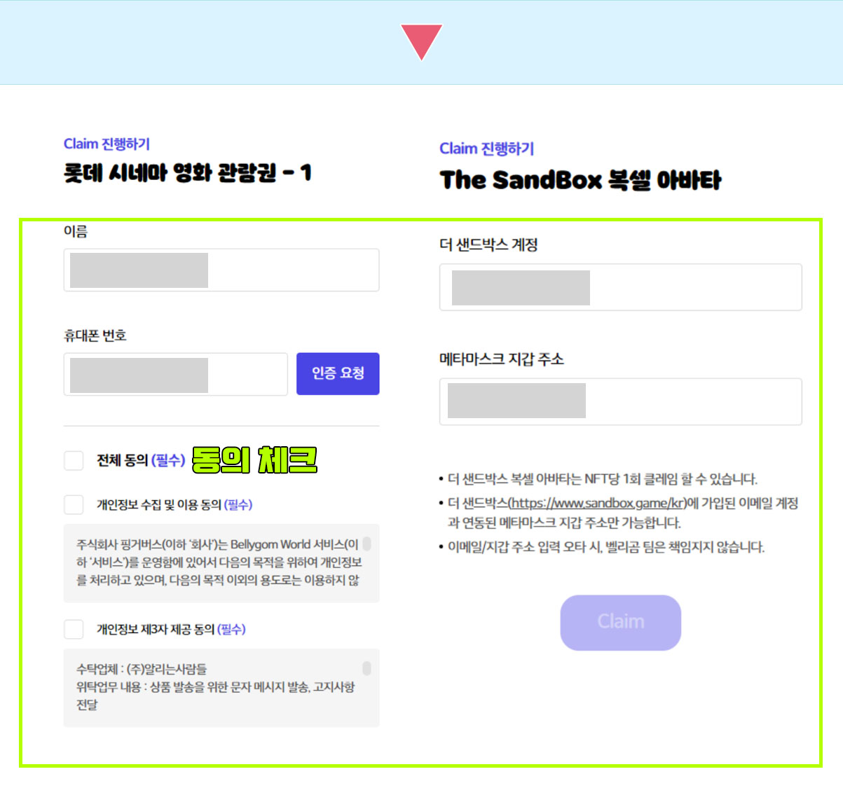 이름과 휴대폰번호, 지갑주소 등을 입력하여 Claim을 진행하면 된다. 엘포인트 전환이 가능하며 롯데시네마 쿠폰도 기프티콘으로 파는 것도 가능하다.