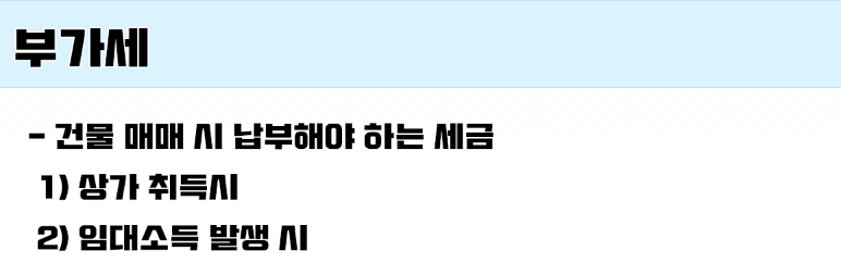 부가세는 건물 매매 시 납부해야 하는 세금으로 상가 취득시, 임대소득 발생 시 발생한다.