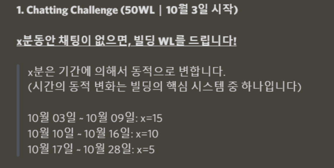 x분동안 채팅이 없으면 빌딩WL를 준다고 한다. 주차별로 시간이 바뀐다.