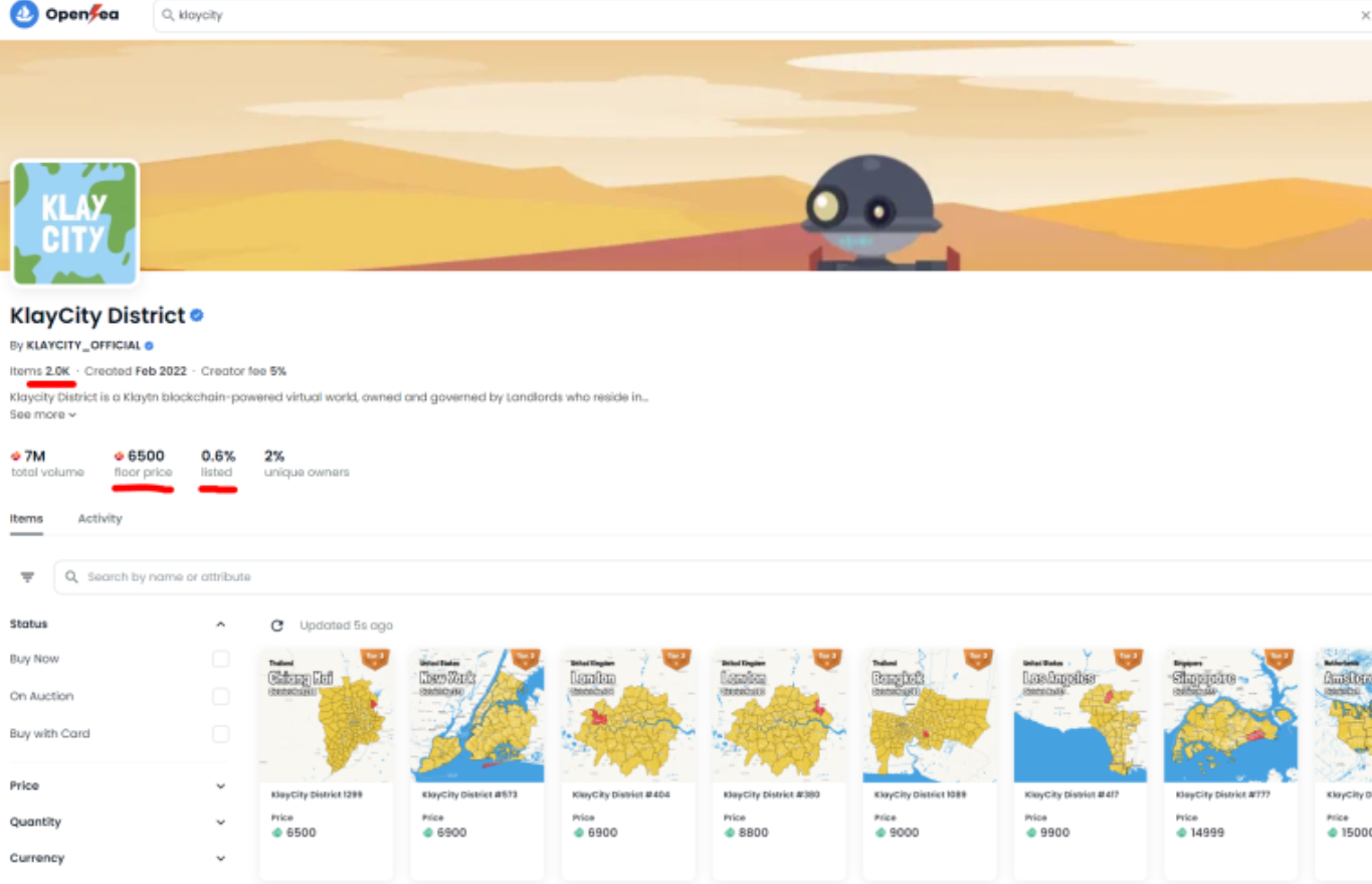 클레이시티는 올초 NFT불장에 큰 주목을 받았고 현재도 탄탄한 커뮤를 유지하고 있다. 오픈씨 기준 바닥가6500클레이를 유지하고 있다.