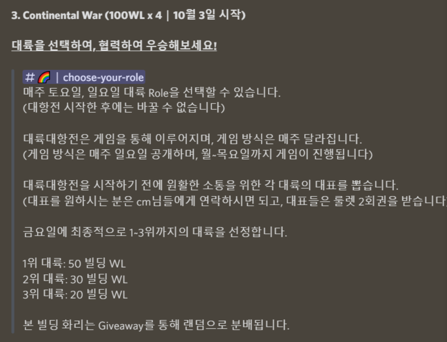 4 - Continental War (100WL x 4, 10월 3일부터~)