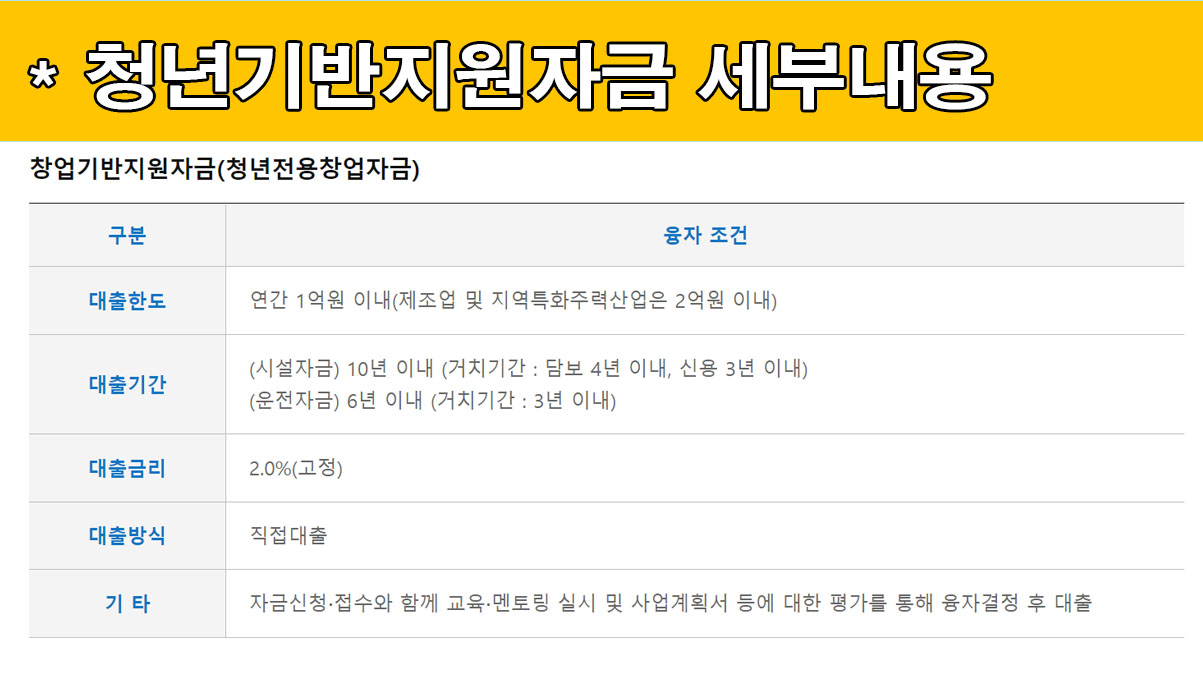 청년기반지원자금(청년전용창업자금) 대출한도는 연간 1억원 이내이다. 제조업 및 지역특화주력산업은 2억원 이내이며 대출기간은 시설자금과 운전자금에 따라 달라진다.