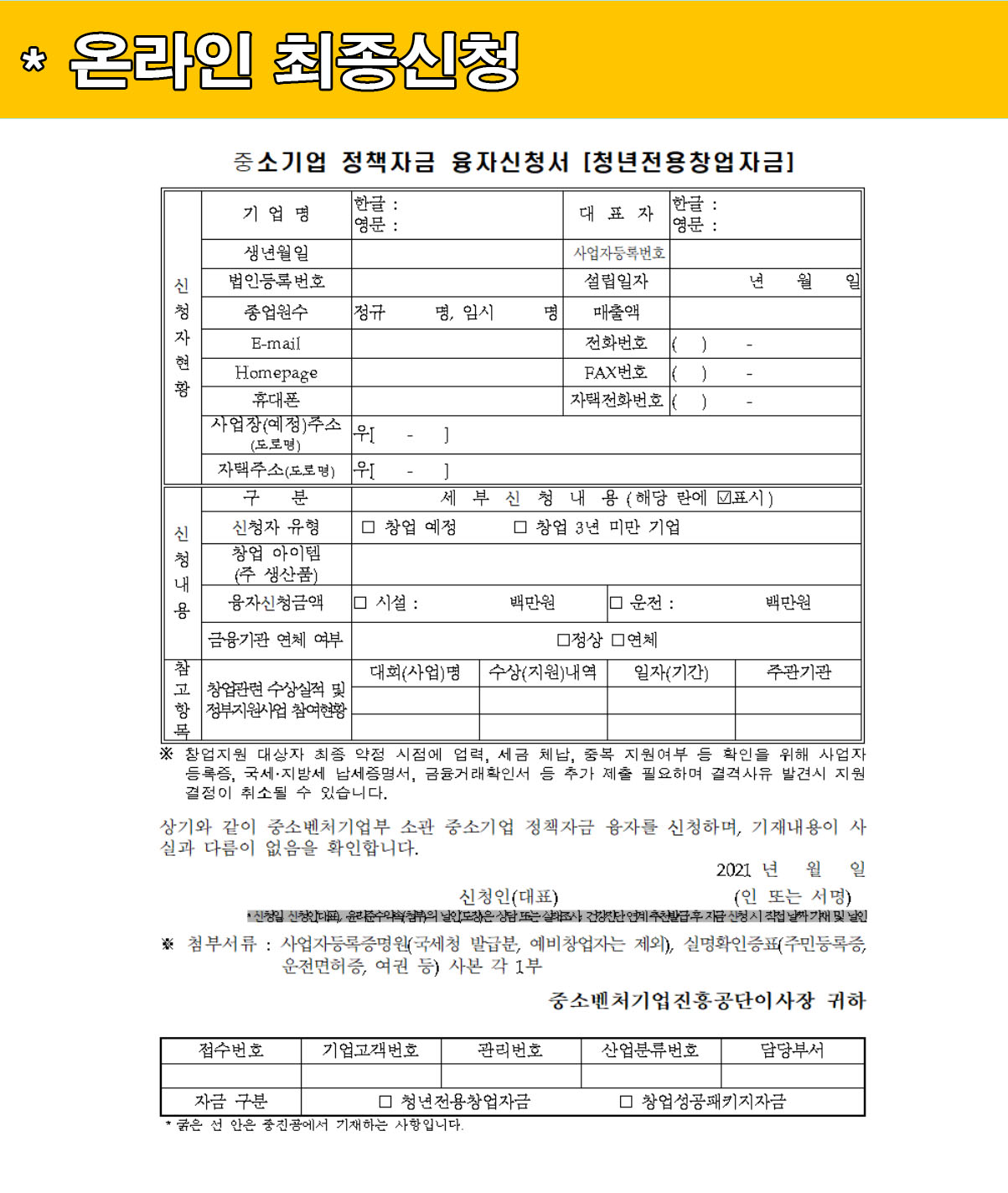 마지막응로 청년창업자금대출 융자 신청서를 작성 후 업로드 하면 현장실태 조사를 통해 자금대출 지원이 최종 결정된다.