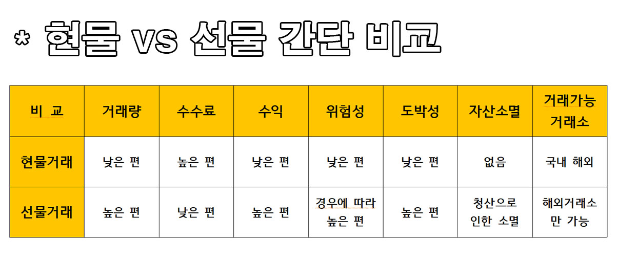선물거래는 단시간에 레버리지를 통한 고수익이 가능하다는 점과 현물거래는 장투 및 분할매수를 통한 고수익이 가능하다는 점이 특징이다.