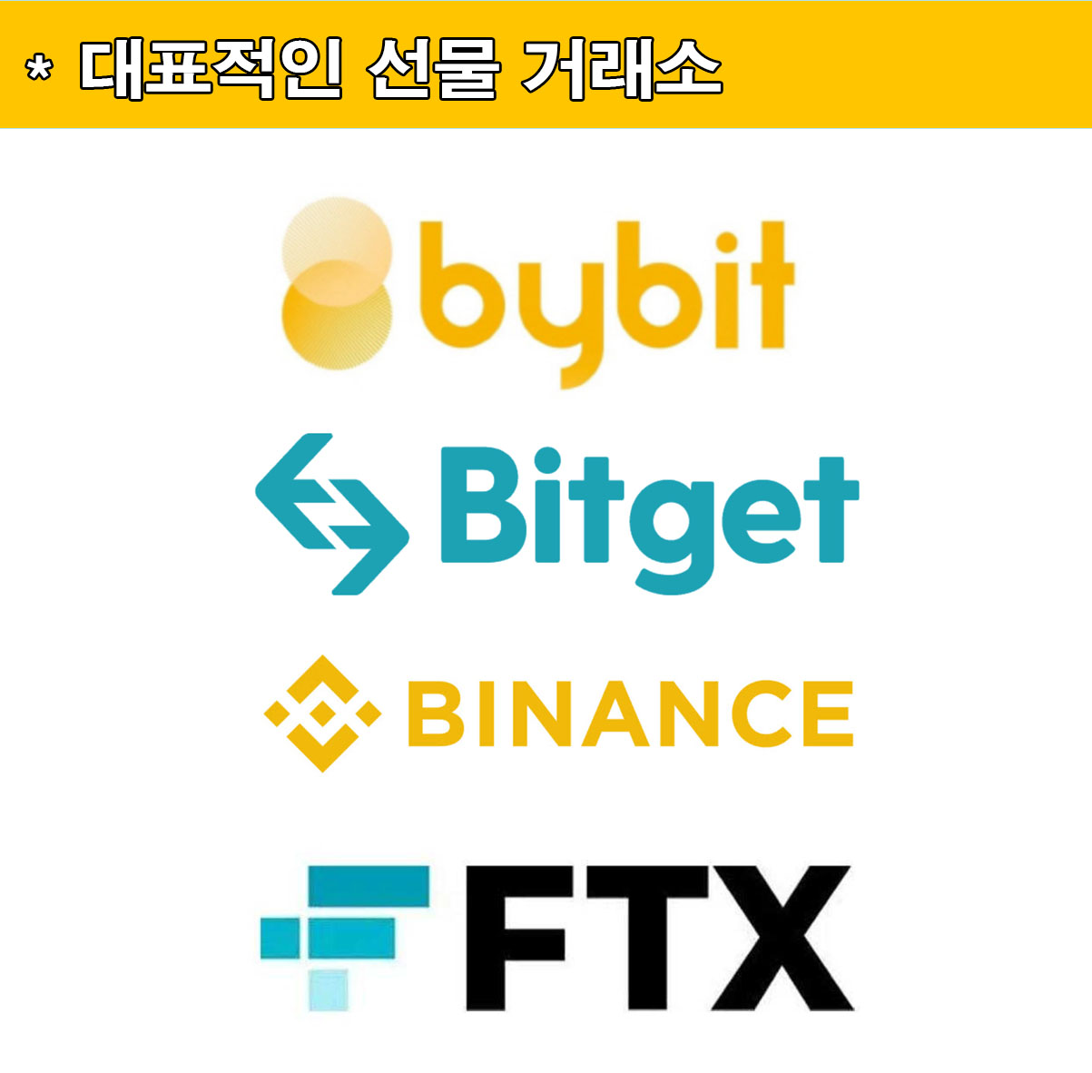 국내 거래소는 선물 거래를 지원하지 않기 때문에 해외 거래소를 이용해야한다. 대표적으로 전세계 거래량 부동의 1위 바이낸스를 시작으로 뒤를 이어 바이비트, 비트겟 , FTX 등이 있다.