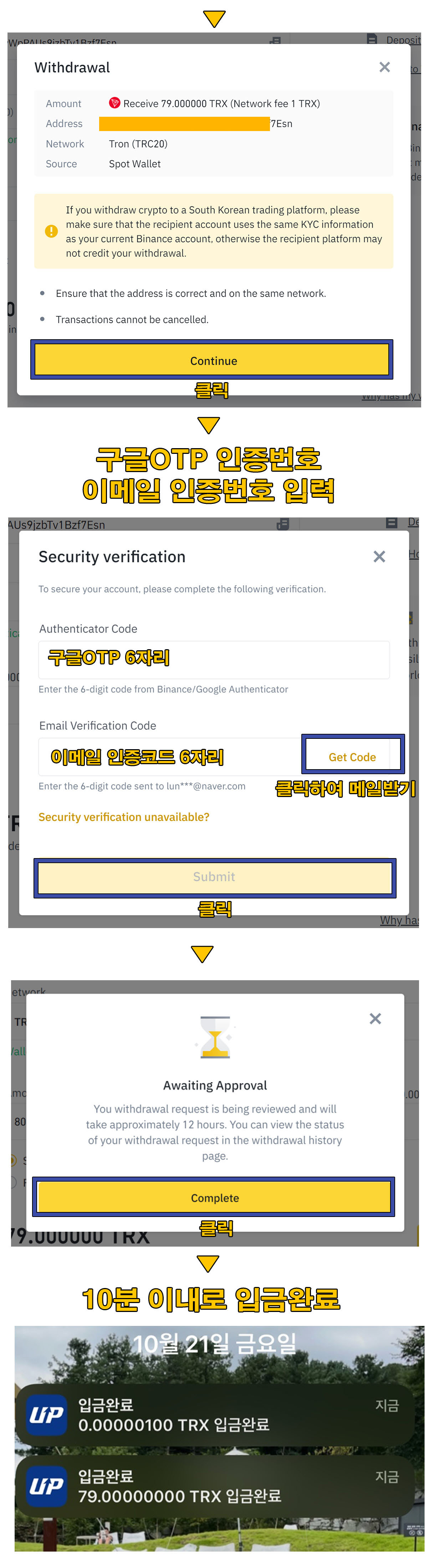 트론 / 출금 수량 / 출금할 주소 / 네트워크 등을 한번 더 확인하라는 창이 나온다. 확인 후 [Continue]를 클릭한다.