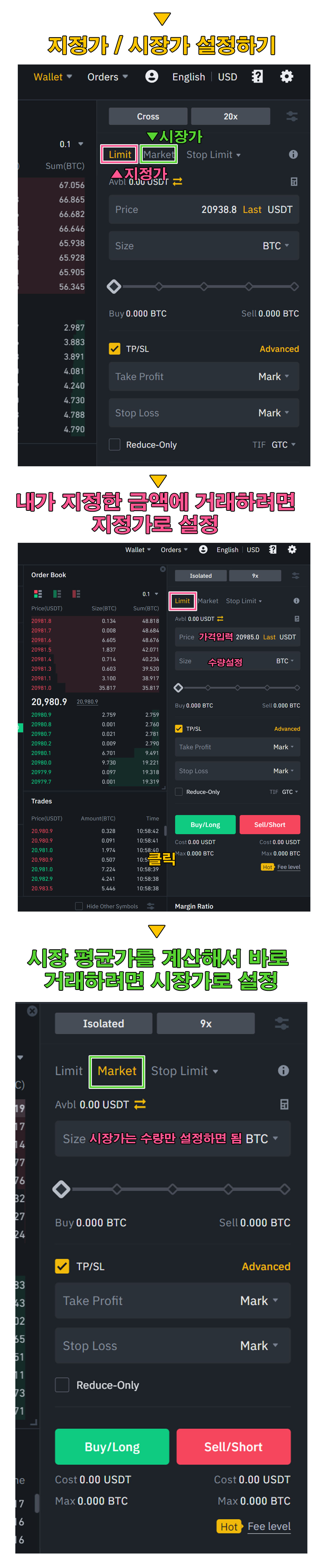 지정가로 진입시에는 가격과 수량을 입력하고, 시장가로 진입시에는 수량만 입력하면 된다.