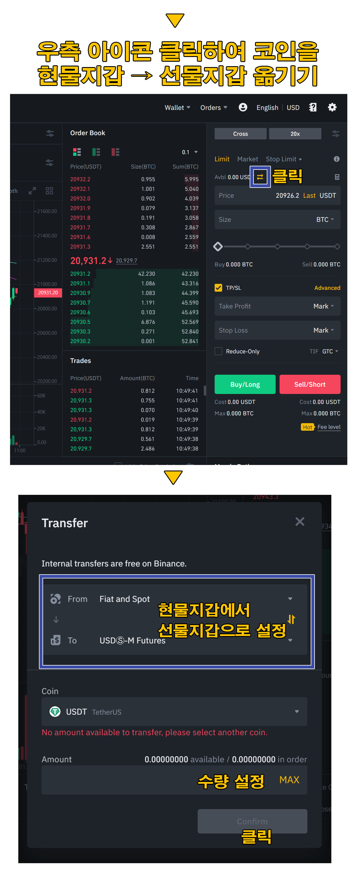 거래화면이 나오는데 우선 해야할 일은 현물 지갑에 있는 USDT 또는 선물 거래할 코인을 선물 지갑으로 옮겨야한다.