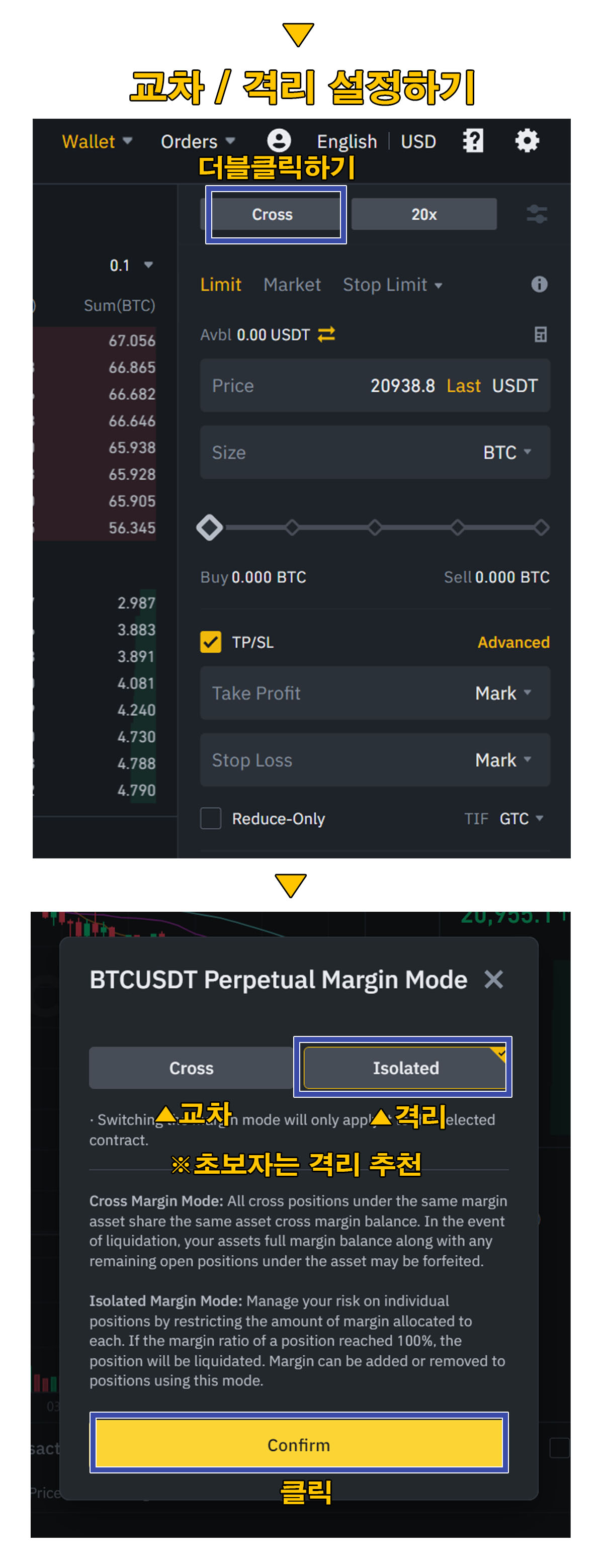 두가지 모드가 있는데 초보자는 [격리]모드를 추천한다. 이유는 포지션을 잡을 때 사용한 증거금만 사용하여 청산하기 때문이다. 교차는 선물 지갑의 금액까지 끌어다 사용할 수도 있기 때문에 지갑에 있는 금액까지 한순간에 쉽게 청산당할 수 있다.