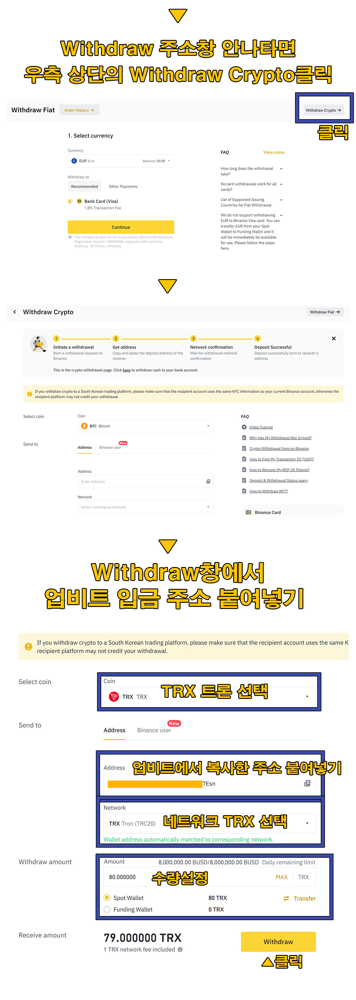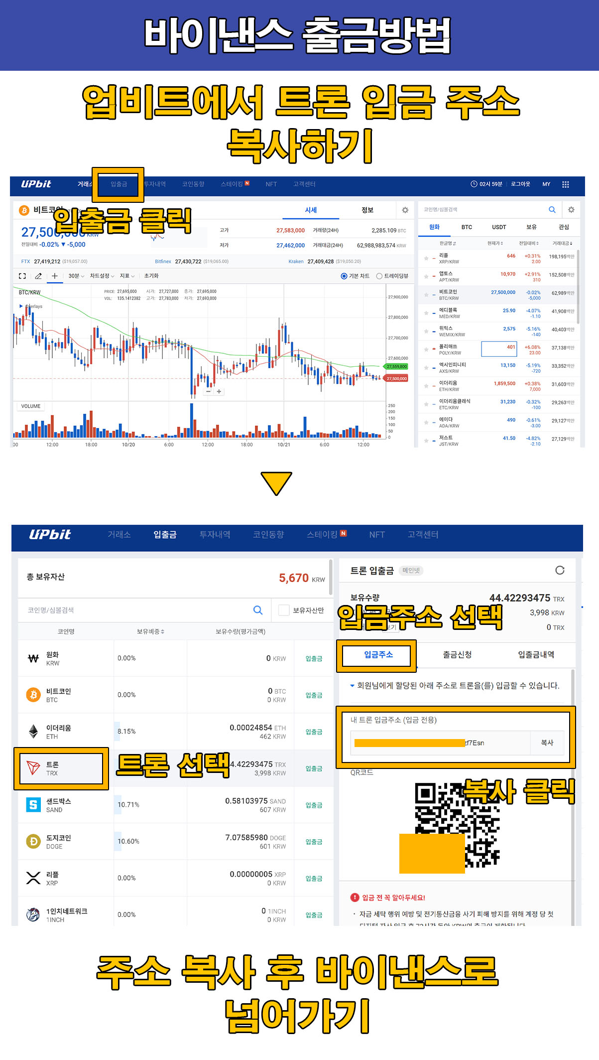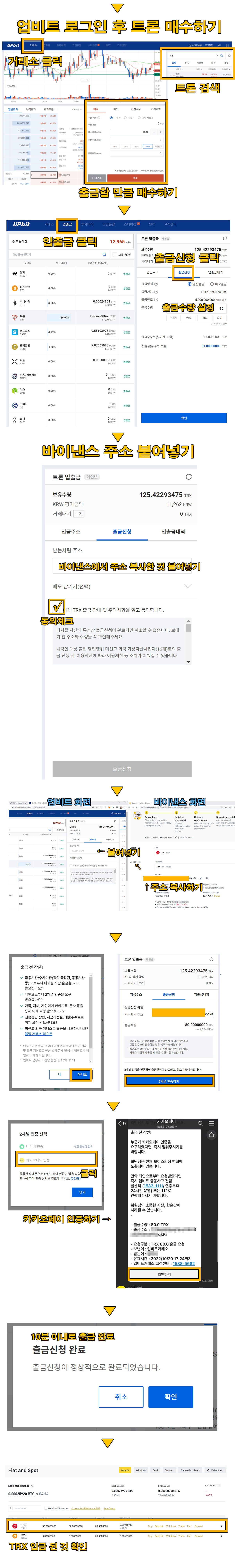 이제부터는 업비트에서 트론을 매수한 후 출금주소창에 바이낸스 주소를 붙여넣을 것이다. 아래의 자료를 보고 천천히 따라해보자.
