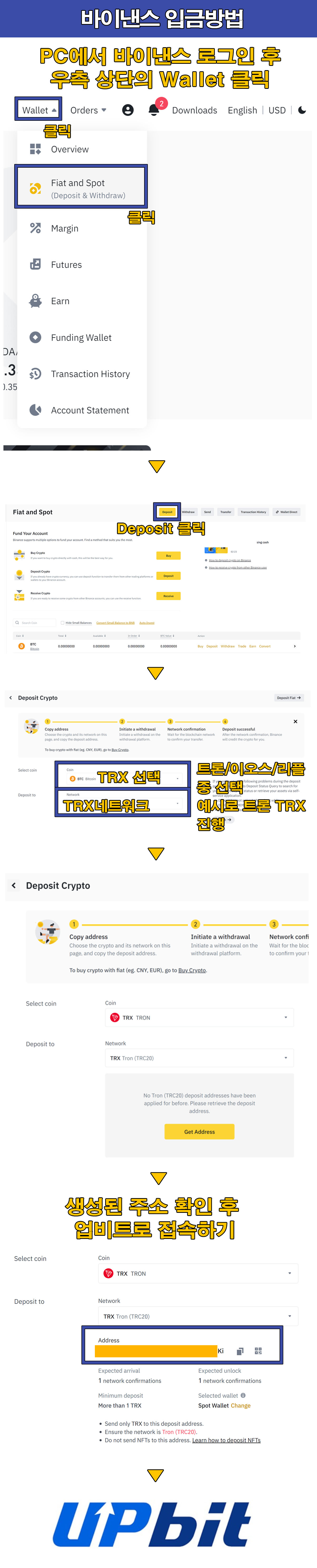 업비트에 로그인 후 상단의 [입출금]탭을 클릭한다. 그리고 자산 목록 중[트론]을 클릭하고 우측 창에서 [입금주소]를 선택하여 [내 트론 입금주소] 에 생성된 입금주소를 복사한 다음 바이낸스로 이동한다.