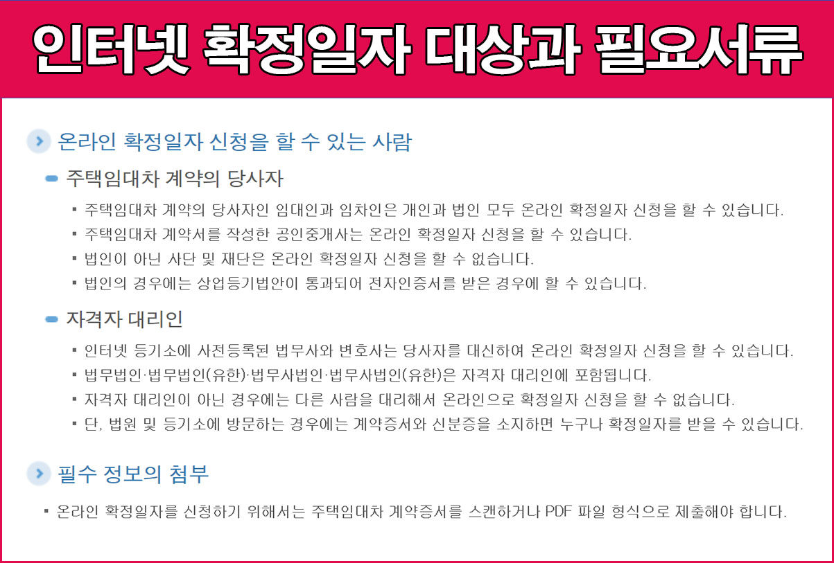 임대차 계약 당사자라면 개인과 법인 상관없이 인터넷으로 전세계약 확정일자를 받을 수 있고 공인중개일 경우에도 주택임대차 계약서를 작성했다면 가능하다.