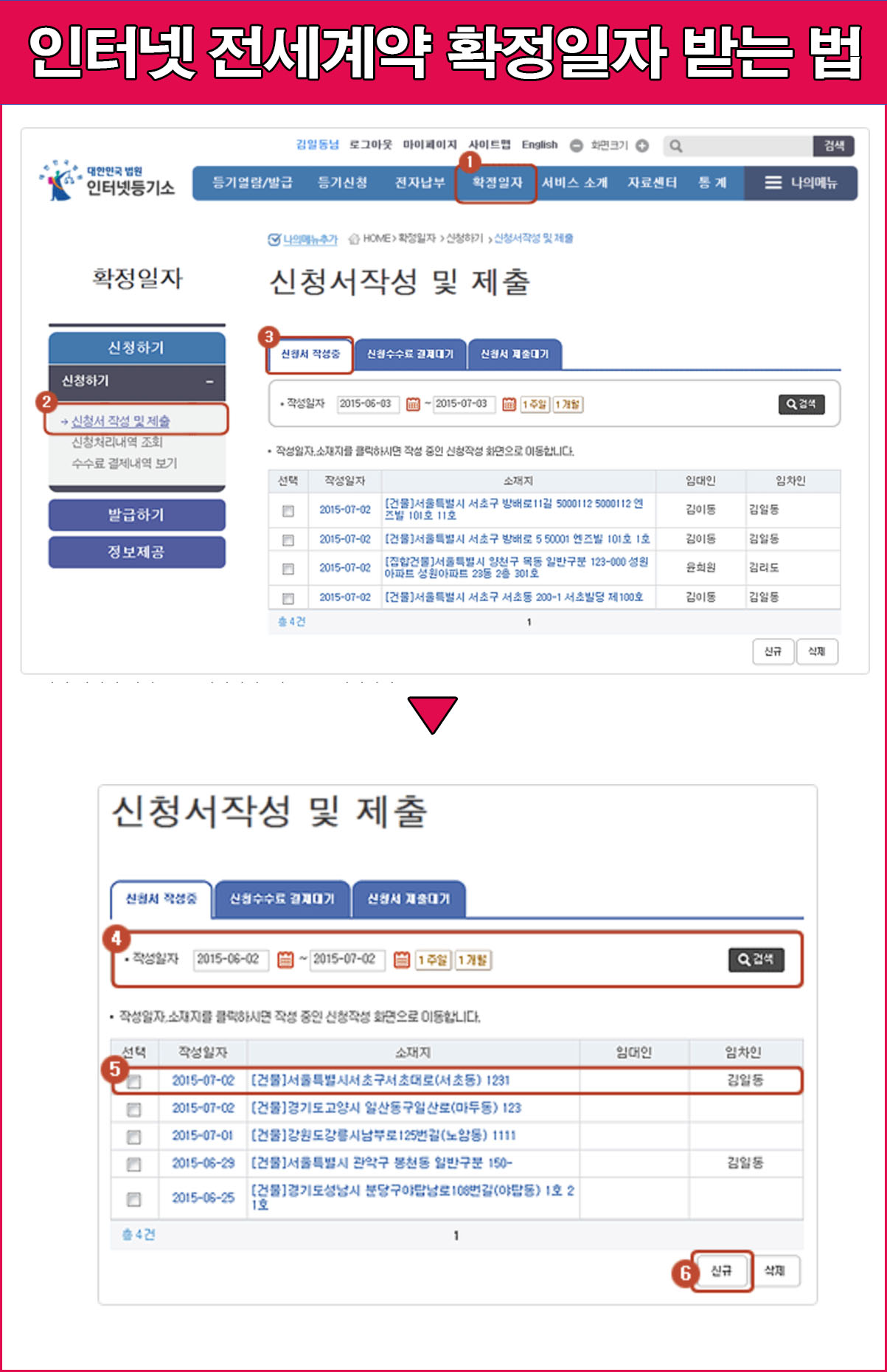 화면 상단에서 확정일자 메뉴로 들언 후 신청서 작성 및 제출을 클릭하면 신청서를 작성할 수 있다.