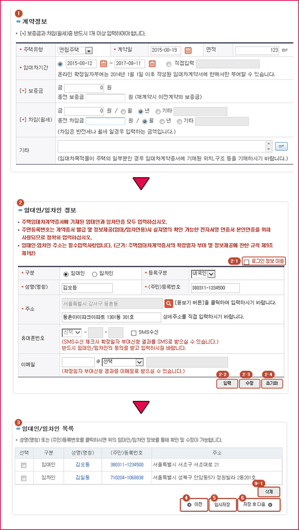 임대차게약증서의 기본정보는 계약서에 있는 그대로를 입력하면 된다. 임대인과 임차인 목록까지 선택하고 성명과 주민번호를 클릭하면 임대인과 임차인의 정보를 통해서 확인과 수정이 가능하다.