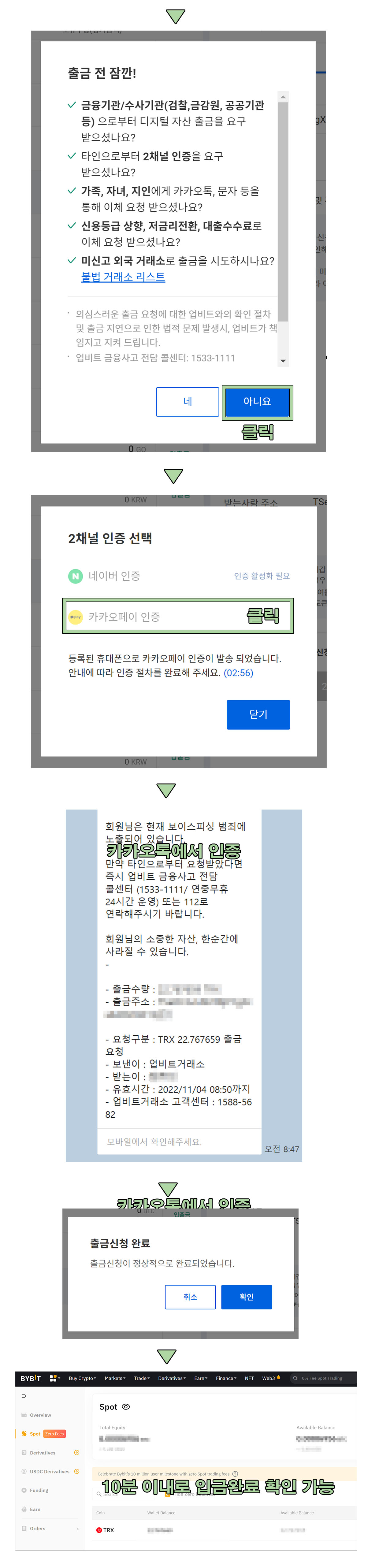 최종적으로 카카오톡으로 온 알림을 확인 후 인증을 완료하면 출금신청이 정산적으로 완료되었다는 창이 뜬다. 이후 10분 이내로 바이비트로 트론이 정상적으로 입금 된것을 확인할 수 있다.